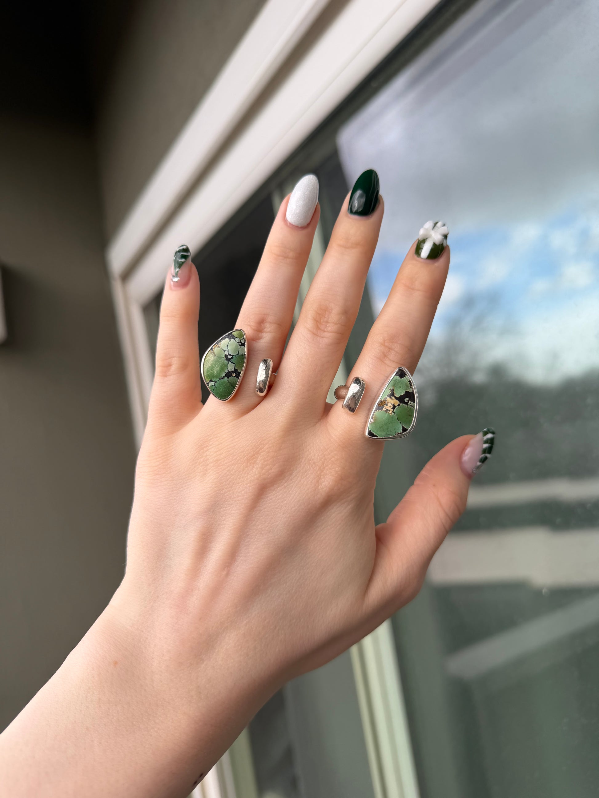 Grounded and steady, these Hubei Turquoise rings are meant to feel like something you grow into. Each ring is handcrafted in solid sterling silver with an open, thick band — a large piece of silver and a turquoise stone facing one another, creating balance and intention in the design.