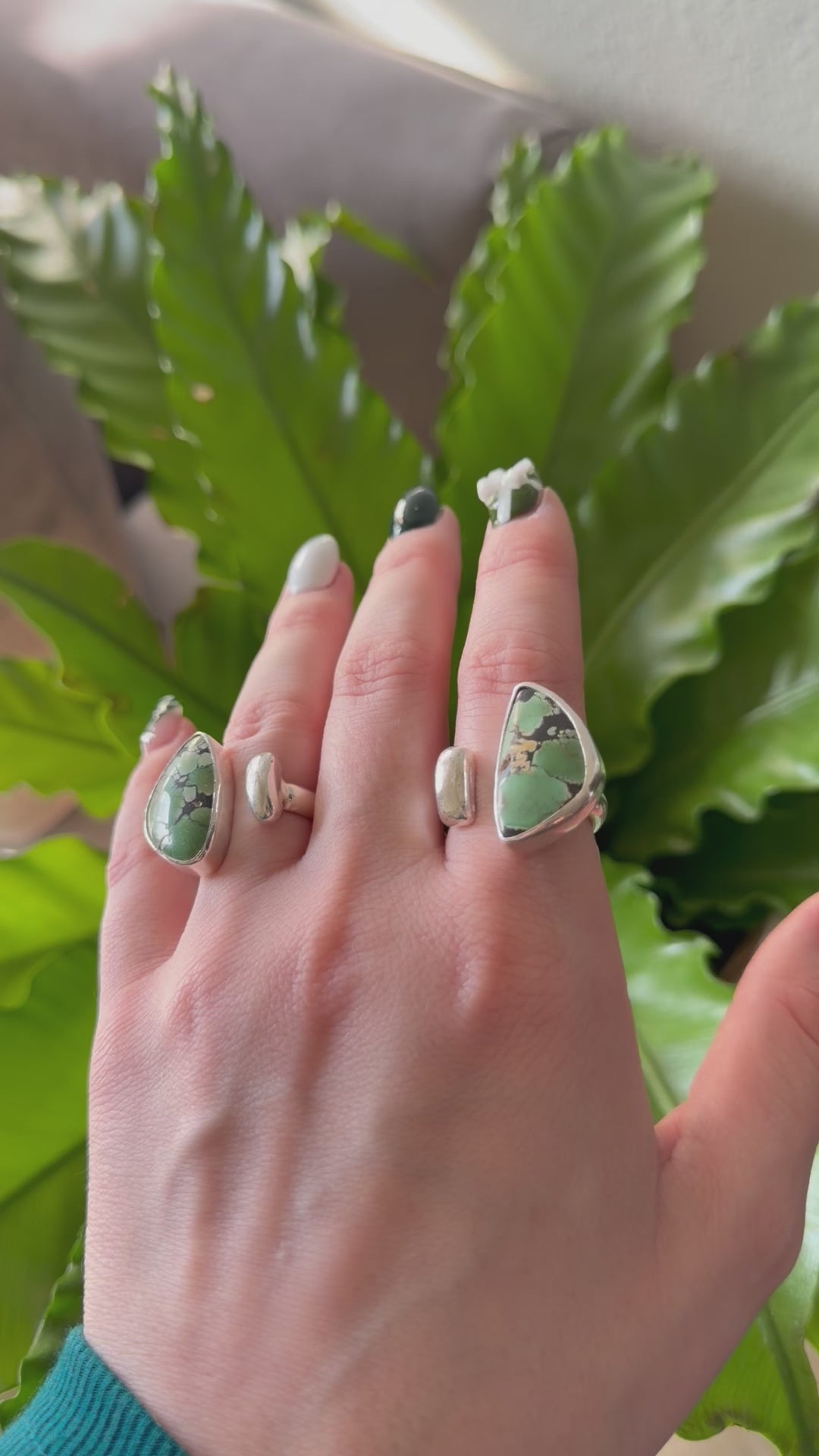 Both rings are one of a kind, sharing the same form but carrying their own character in the stone — earthy green tones, natural matrix, and the feeling of something truly rooted.