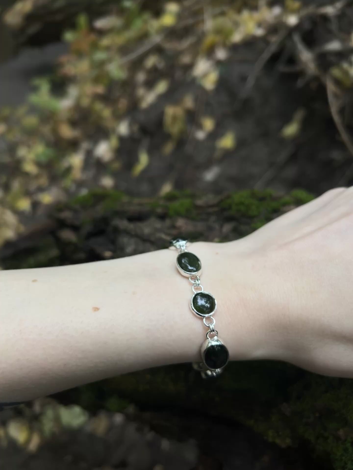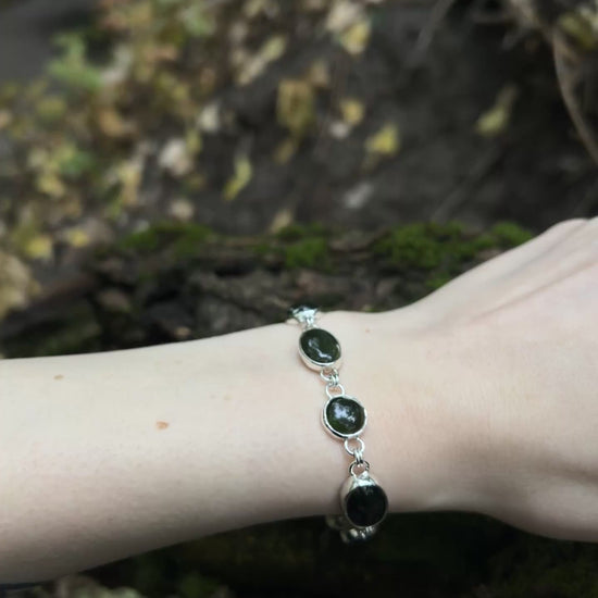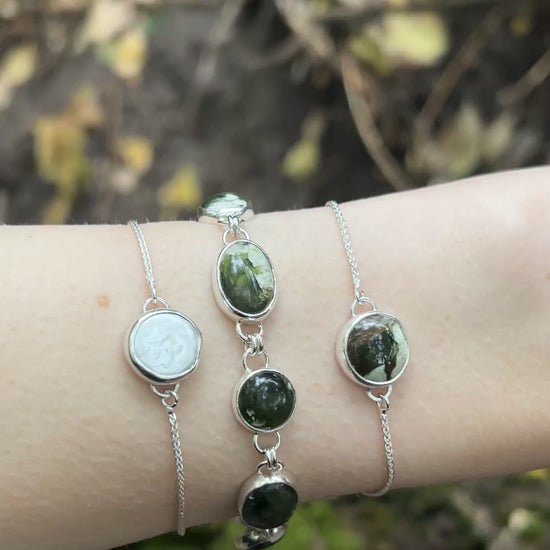 A bracelet said to be woven by unseen hands beneath the canopy — where star light filters through the trees and sprites dance between roots and moss. Eight glowing chrome chalcedony stones shimmer like captured forest light, each set in sterling silver and linked together in quiet rhythm.