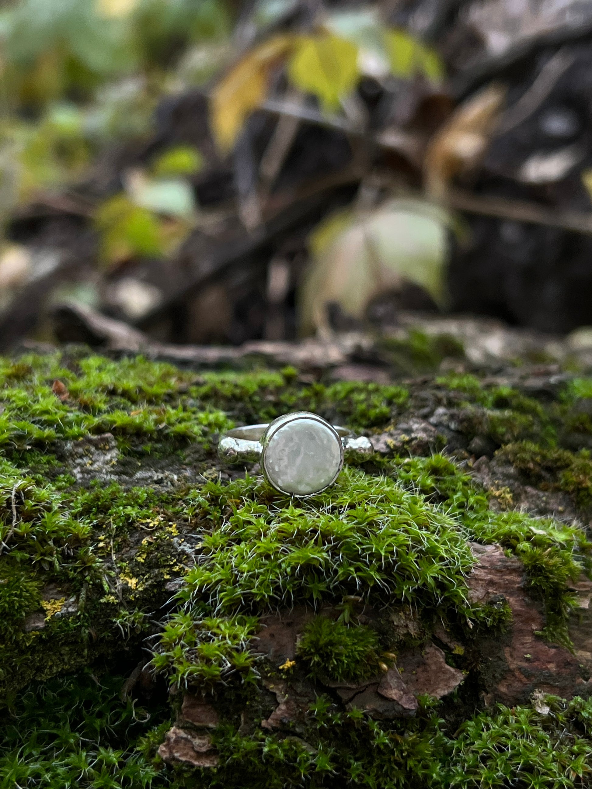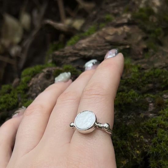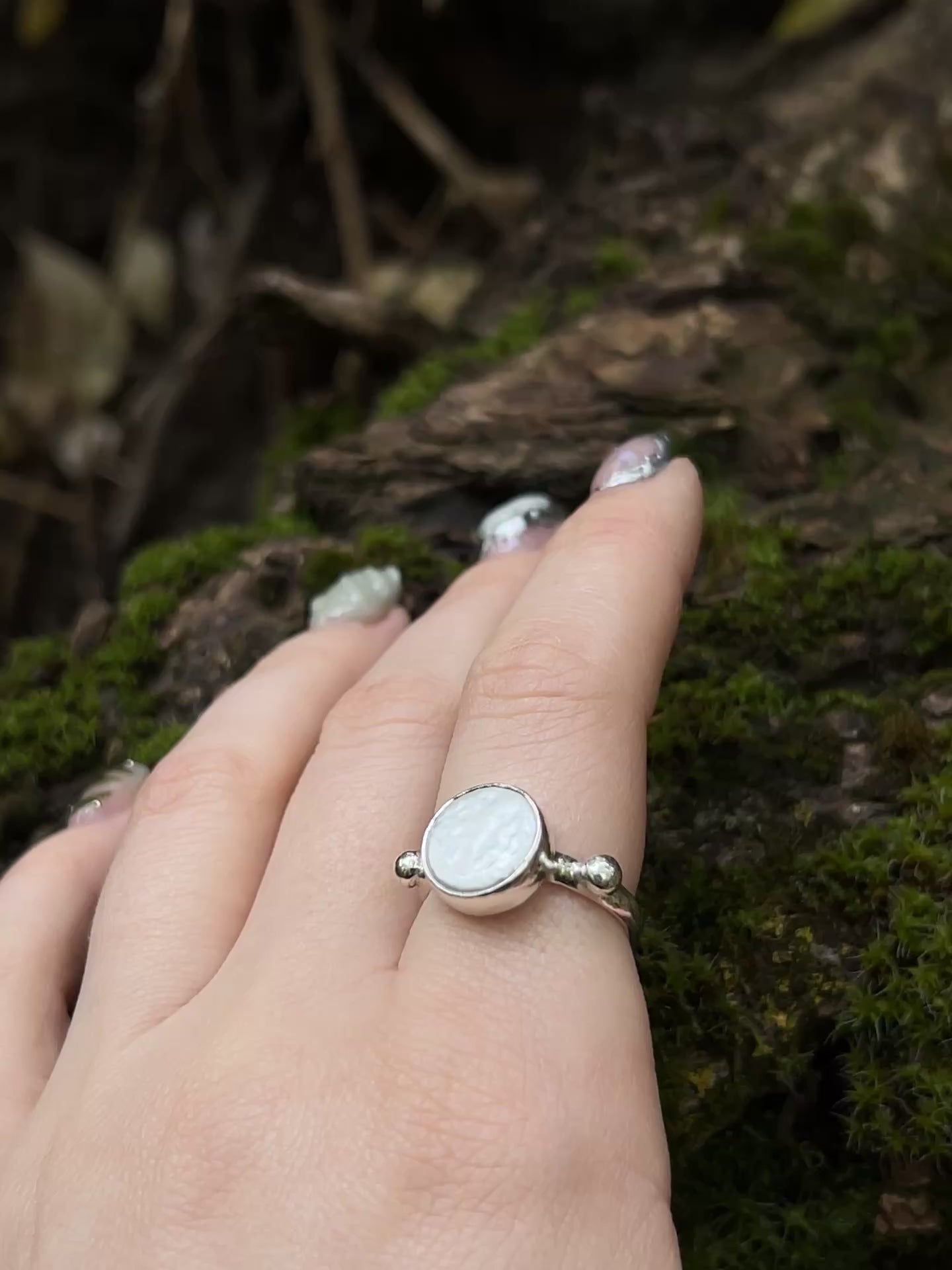 A freshwater pearl set in sterling silver, accented with a small silver ball on each side of the band. Simple and soft, it feels like a quiet moment of light — the kind that lingers between branches before fading into the trees.✨