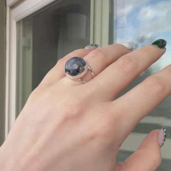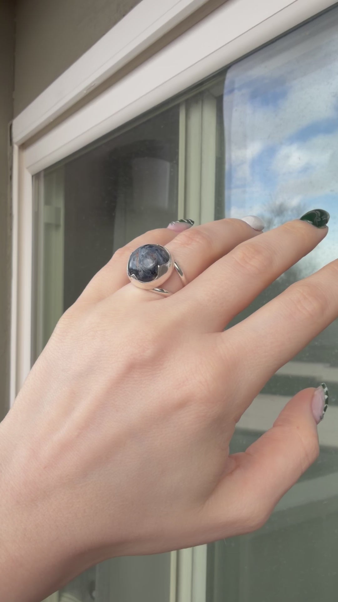 Formed under pressure and marked by movement, this Pietersite ring holds the feeling of a storm that’s already passed. Deep blues and charcoal tones shift across the surface, set in a hand-shaped crown bezel of sterling silver.