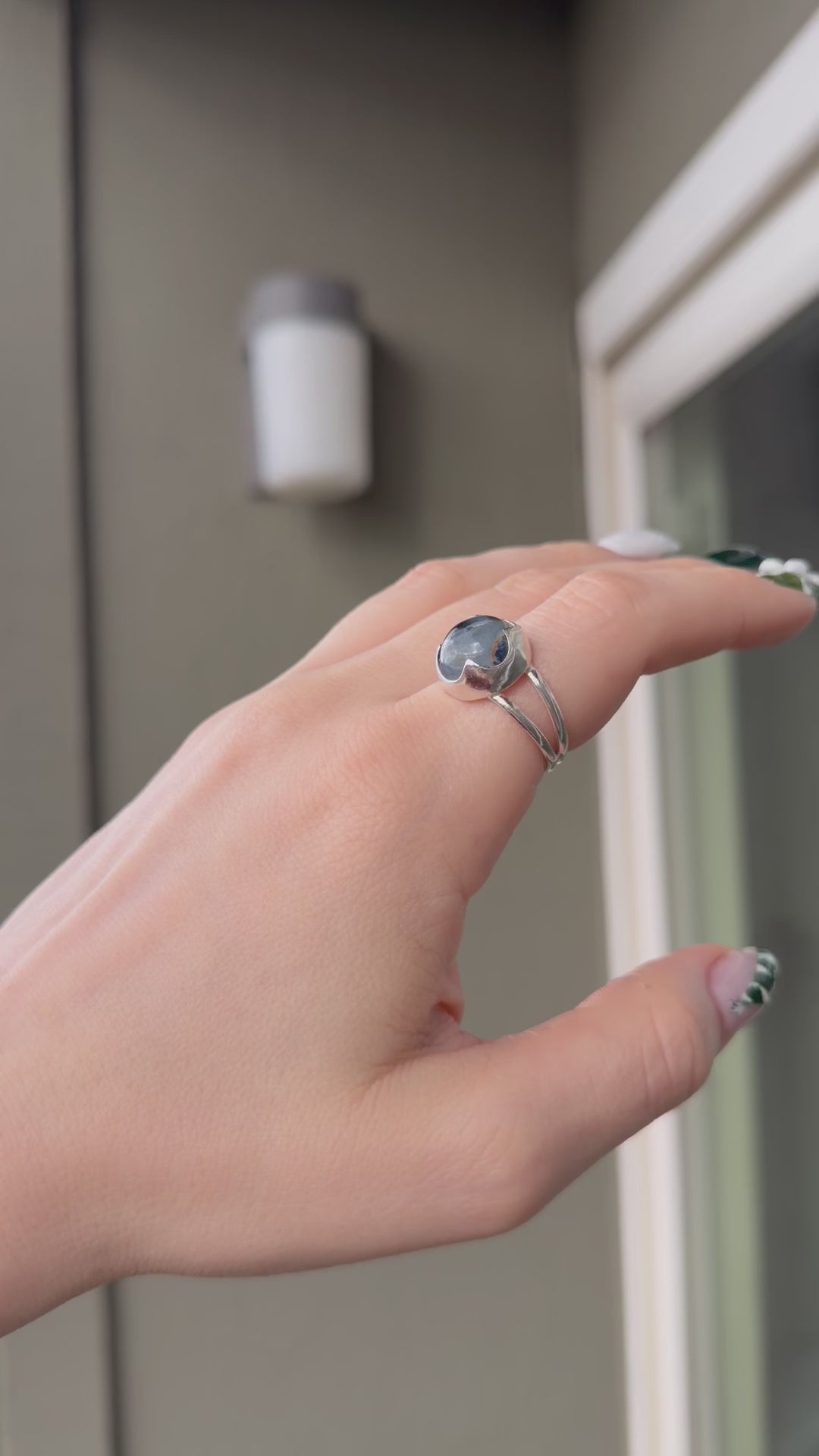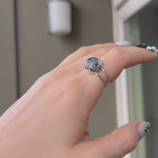 Quiet but full of motion, this Pietersite ring carries soft flashes of blue and charcoal beneath its surface, set in a hand-shaped crown bezel of sterling silver.