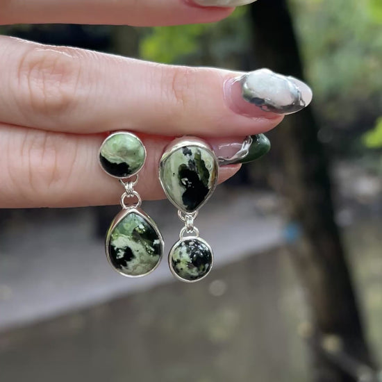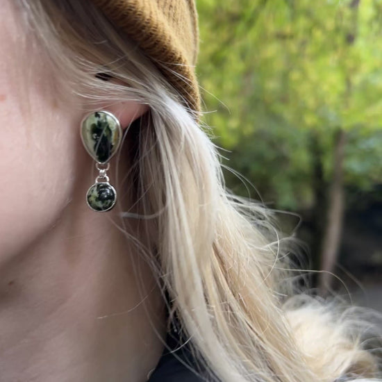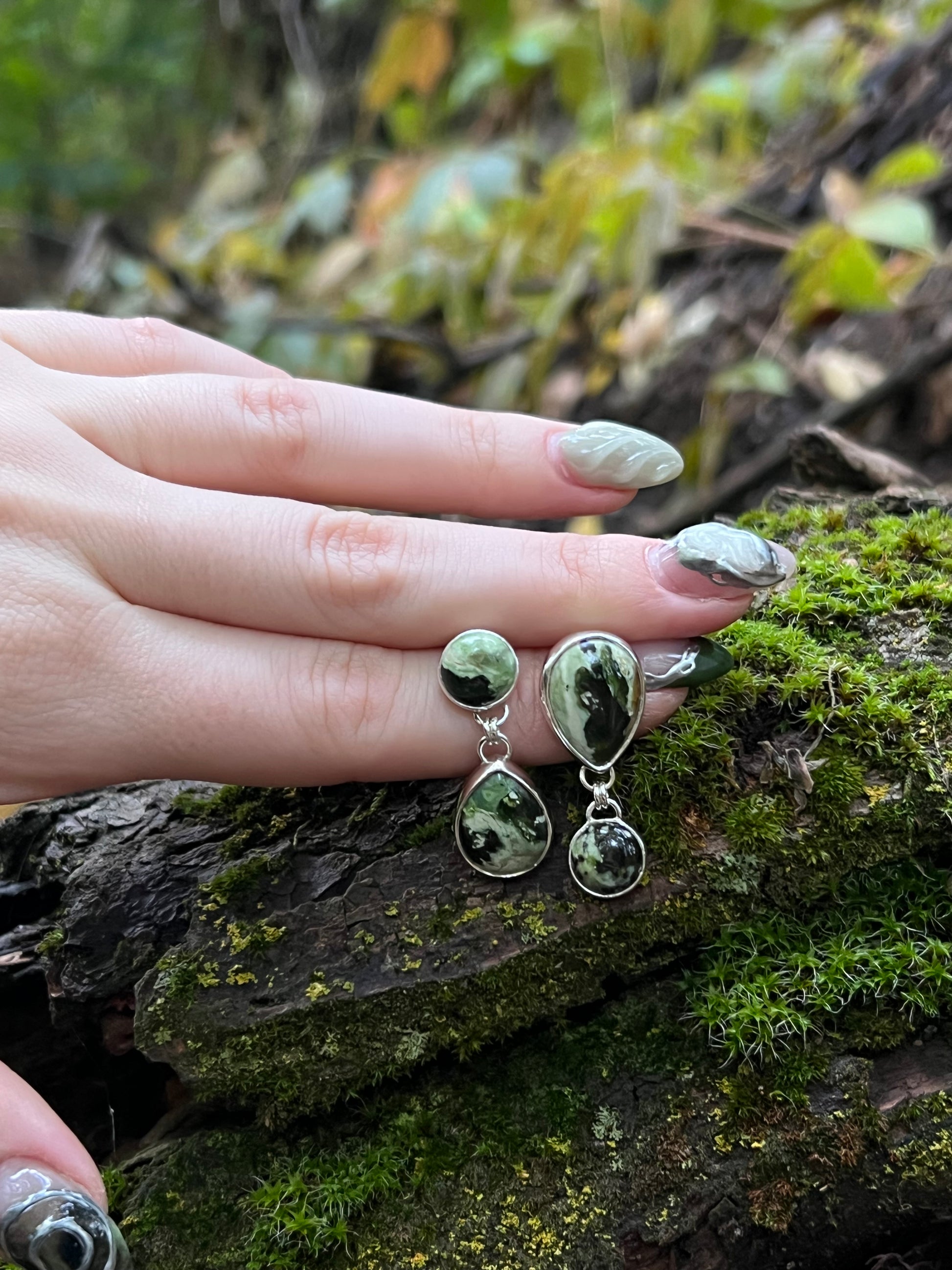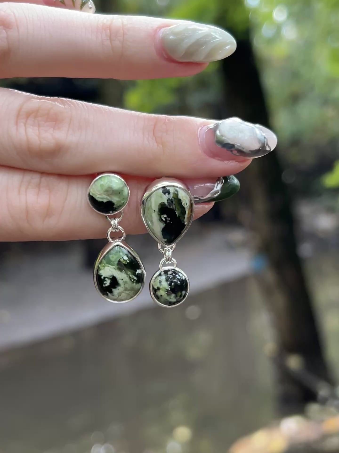 Each earring mirrors the other in reverse — twin chrome chalcedony stones set in sterling silver, flipped in design like reflections across still forest water. Their green and brown hues shift softly, capturing the quiet shimmer of starlight through the trees. ✨